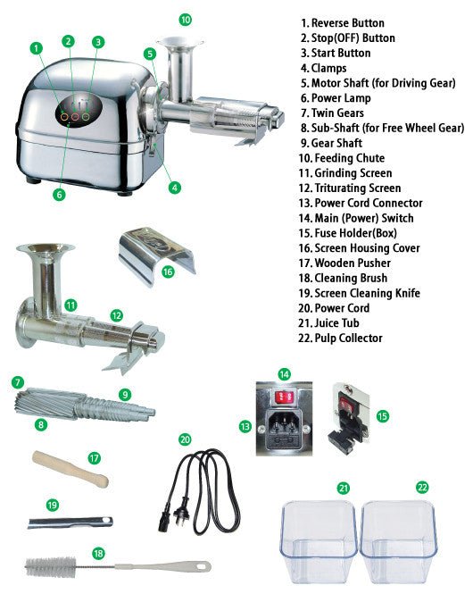 The crushing of produce is done using very slow grinding, which generates no heat in the process. Keeping heat generation to a minimum is absolutely critical because heat leads to oxidation of vital nutrients and destruction of active enzymes. At only 86 RPMs, the Super Angel is the slowest grinding twin gear juicer on the market.